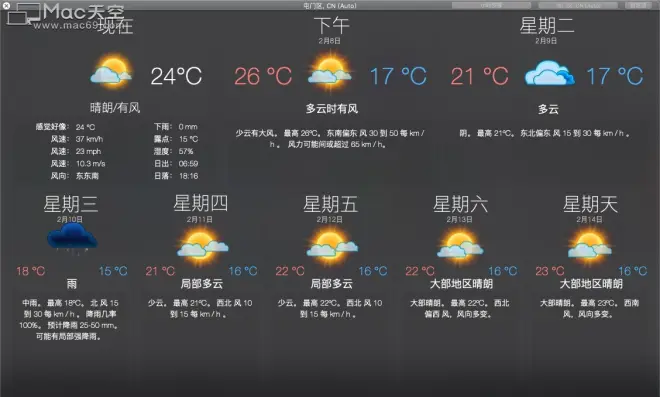 -单击停靠栏图标,详细的天气预报窗口