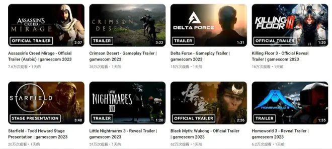 IGN最近发布的科隆游戏展预告视频中,《黑神话》无疑是最抢眼的亮点。在视频曝光后,它在Youtube上迅速引发了60多万的播放量,遥遥领先于其他热门游戏。相比之下,《使命召唤》只有近50万,《赛博朋克》只有36万。而《黑神话》的实机演示播放量为106w,在一众实机演示视频中排第二,仅次于《真人快打1》。