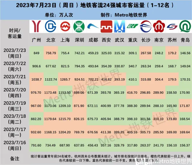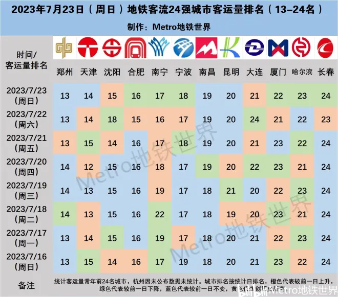 广州连续两日排名第一,继续守护休息日之王称号。北京连升两位超越沪深来到第二。第五至十四位客流排名稳定,只有武汉超越重庆来到第七。沈阳强势反弹连升三位超越肥邕甬,大连也连升三位超越厦哈春。