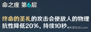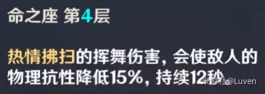 辛焱的天赋可以在挂盾期间增加主C的物理伤害,4命的话有一个减物理抗性的效果,所以若上场的话需要有4命。缺点:盾太脆,并且是火元素角色,不太适用于雷泽。