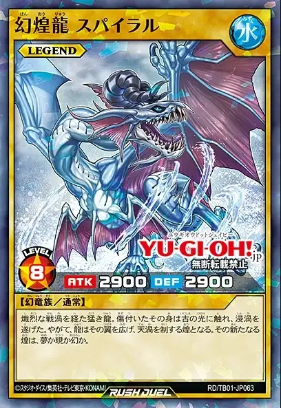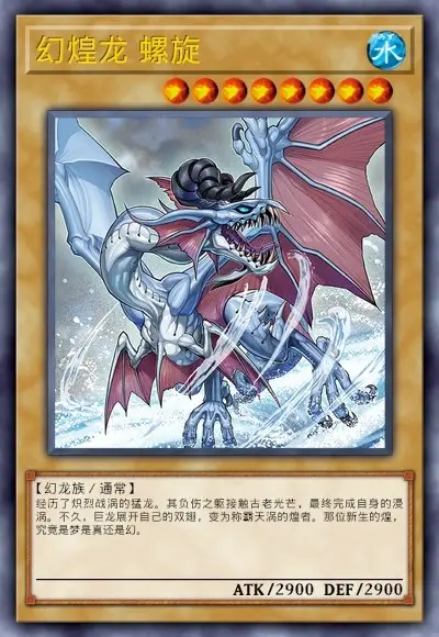 「幻煌龙 螺旋」,罕贵是NP,8星、水属性、幻龙族、通常怪兽,攻击2900守备2900,传说卡。OCG卡RD化。可以被「幻刃龙 建造龙」和「幻刃步哨 研磨龙」特召,便利出2900攻防,还可以。量贩卡包的传说卡,多半会有支援卡,不一定立马出。