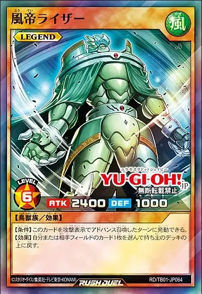 「风帝 莱扎」,罕贵是SR,6星、风属性、鸟兽族、效果怪兽,攻击2400守备1000,传说卡。OCG卡RD化,RD改。又1只帝王,古早6属性帝王还差暗、地和水。可以弹任意1卡;对额外怪兽更加好用,弹卡组顶会处理成回额外卡组,非破坏解场,解场后在额外卡组不在墓地,减少再利用;偶尔有主卡组的登场效果很猛的怪兽,就悠着点,因为是回卡组顶,下1抽能上手。风鸟,很契合鹰身主题;帝王本家卡,帝王主题也能考虑一下。