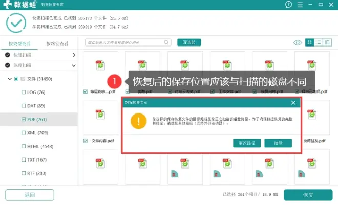 4.将所需要恢复的文件勾选完成后,点击右下角【恢复】,并将文件保存在一个与扫描的磁盘不同的磁盘中。
