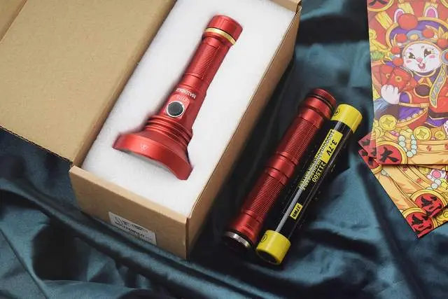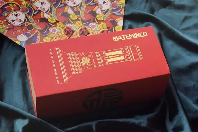 手电的包装很用心。我拿到的是红色限量版,不仅封套都是象征着喜庆团圆的红色(大红的外封上烫金的福字异常醒目),而且线条勾勒的效果图特意做了烫金处理。而拆到外封后,内盒则迈特明酷家统一的牛皮黄瓦楞纸盒装。一角处贴有版本型号。