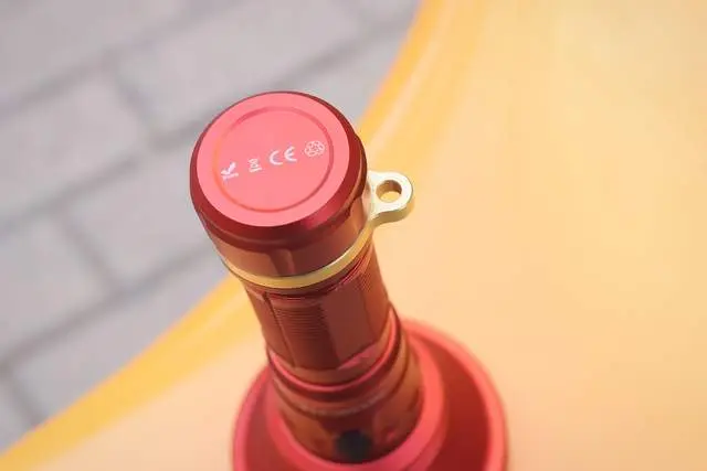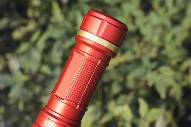 此款手电的做工相当精致,握持手感也颇佳。三切面+横断纹滚花处理细腻舒适。尾盖处的黄铜绳环与醒红皮肤相得益彰,犹如“钢铁侠”。