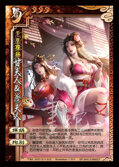 〖殉别〗限定技,当你进入濒死状态时,你可以将武将牌改为甘夫人或糜夫人(不能选择场上已有的武将),然后回复体力至1并防止所有伤害直到回合结束。
