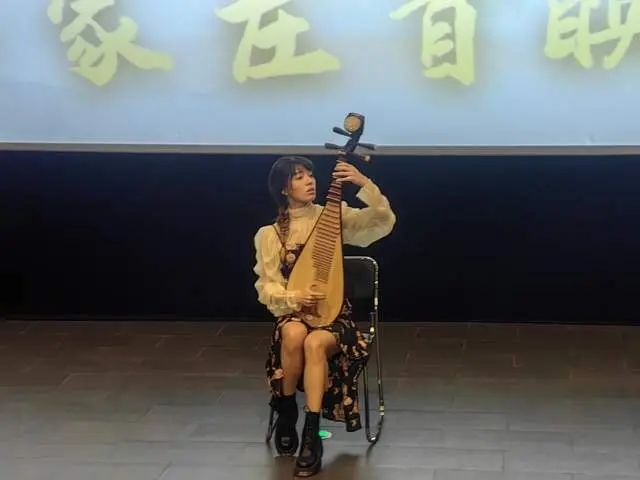 ▲主演吉元雪在影片首映礼现场表演琵琶演奏