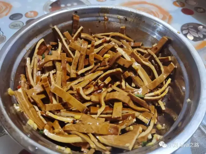 1.在豆干中倒入姜蒜、酱油、芝麻油、老抽、白糖、辣椒、葱,然后在进行搅拌,完成一道凉拌豆干。