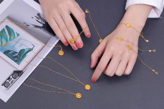 简单时尚的5G黄金首饰,搭配纯色西装。简洁又不失庄重。在首饰的天然光泽的映衬下,给整体带来自然的柔光滤镜,举手投足之间带来点点微光。这种不经意流露出来的光芒,才最动人。闪耀的5G金饰款式新颖,很当下很受欢迎的黄金工艺,ins风设计,轻盈简约非常有个性,设计独特,不容易撞款,特别适合喜欢时尚,且日常通勤好搭配的女孩子。