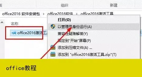 7、点击安装包里的office2016激活工具文件夹,鼠标右击office2016激活工具,选择以管理员的身份运行