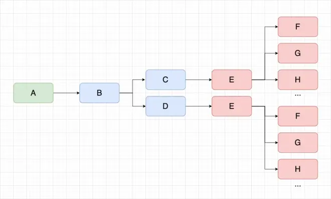 在资产的 A 任务血缘链路中,C/D 任务下游均为 E 任务,当我们同时打开了 C/D 任务的下游节点,就会发现大量的重复节点出现,但本质上他们是一模一样的任务节点,如下图。