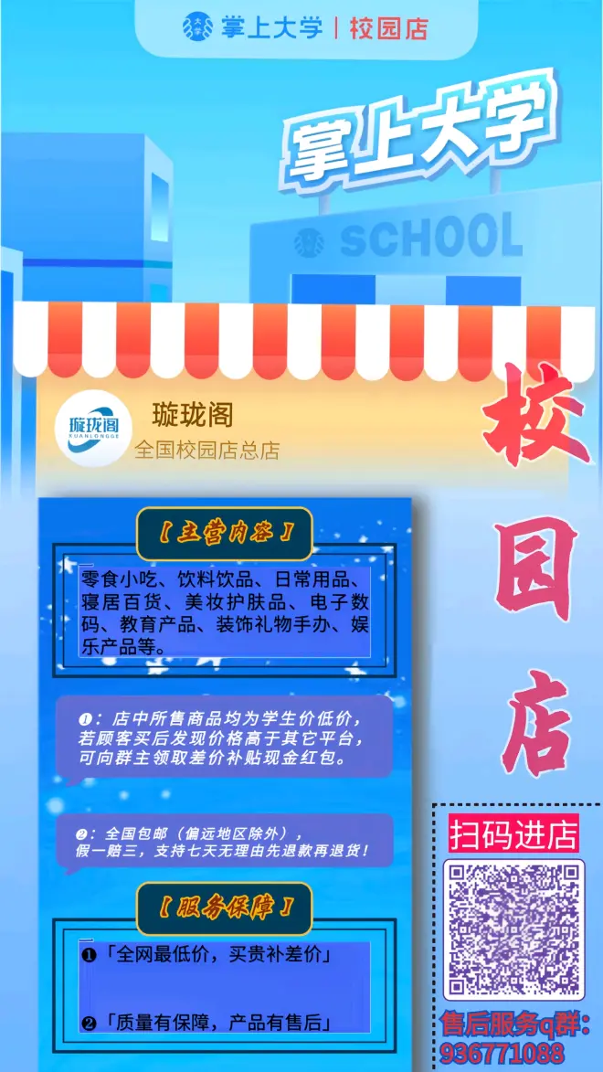 全国校园店开业,致力于打通学生市场! 欢迎进店选购! ☞【主营内容】零食小吃、饮料饮品、日常用品、寝居百货、美妆护肤品、电子数码、教育产品、装饰礼物手办、娱乐产品、服饰穿搭等。 ☞【开店福利】本店是校园店,主要面向学生群体,产品均以低价学生价销售。新人首购领累计55元优惠券,满一百减三十,满五十减二十,满十减五。 ☞【服务保障】 ❶「全网最低价,买贵补差价」 校内员工承诺为顾客提供的所有商品价格不高于该商品在任何平台旗舰店的价格,若粉丝购物后发现价格高于其它平台,则联系群主提供差价补贴现金红包。 ❷「质量有保障,产品有售后」 全国包邮(偏远地区除外),假一赔三,支持七天无理由先退款再退货!