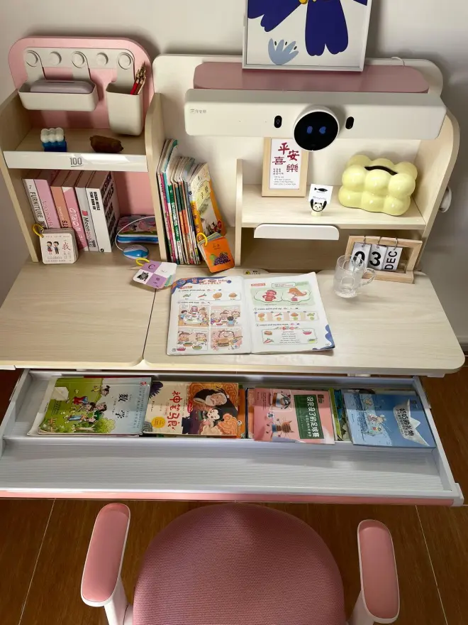 作业帮AI学习桌梦想家款智能化功能做得很出色,书桌的基本功也很扎实。首先它采用了多收纳功能区设计,拥有10大收纳区,可以更加整洁高效的收纳文具、书籍、书包、绘本等等,最多可以收纳超过一百本书籍,有助于让孩子养成收纳的好习惯。桌面高度支持54-76厘米调节,孩子长高也可以继续使用,让学习桌陪伴孩子更长的时间。