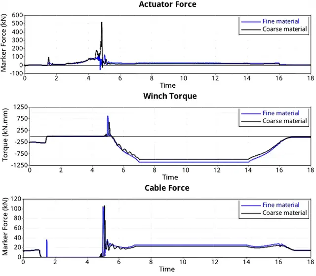 针对不同物料输出抓斗从接触物料、抓取物料、抓取后离开舱体的执行机构受力、曲柄扭矩、缆绳受力曲线,其中,可以根据曲柄扭矩获取电液荷载大小,从而得到整机合理的运行功率。
