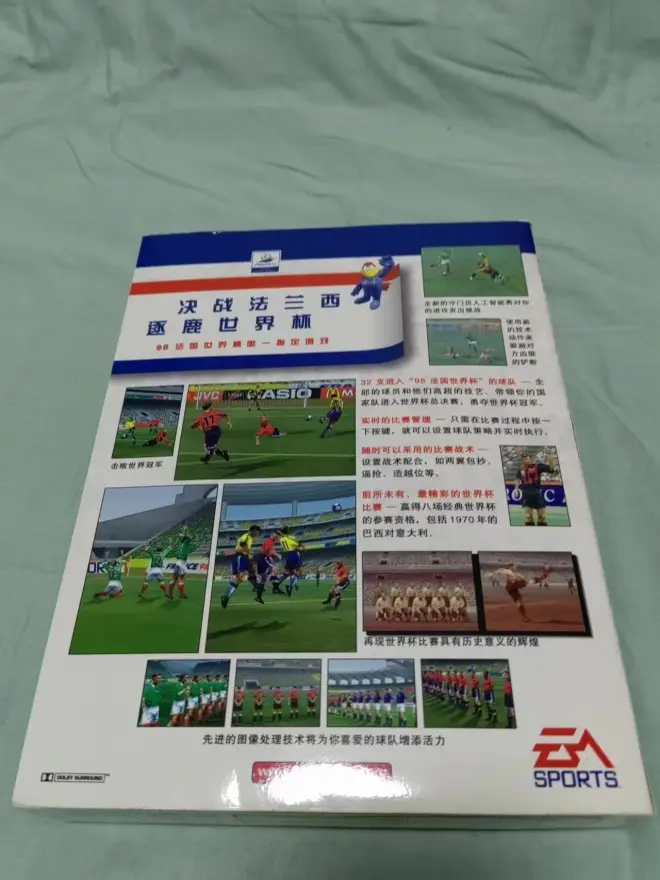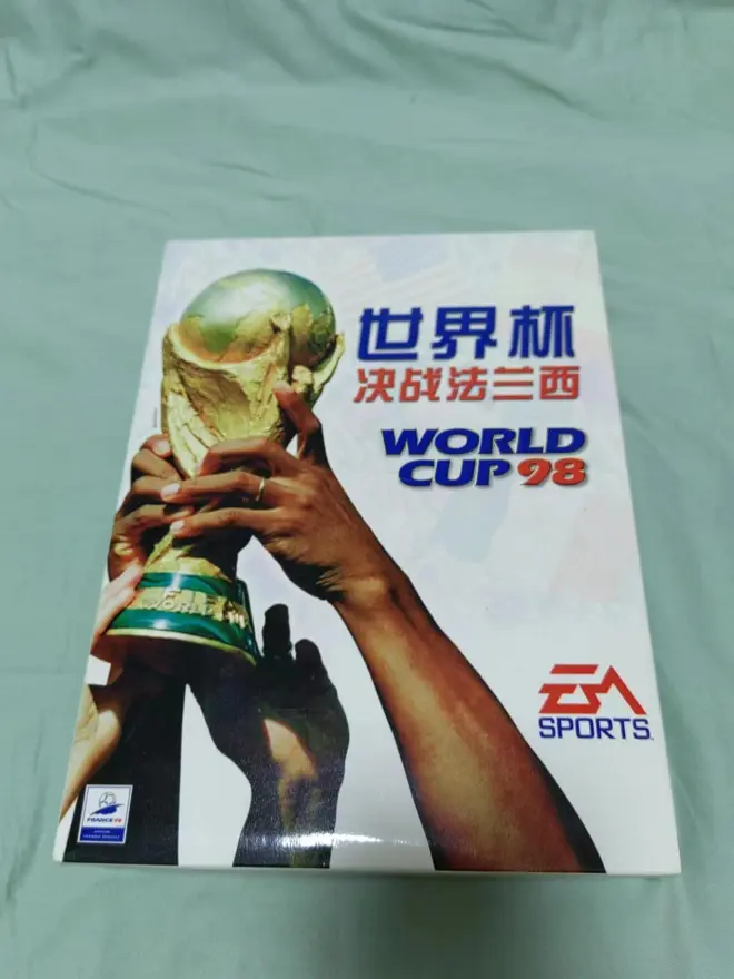 游戏正版的封面简洁,但又似乎说明了一切,举起的大力神杯令无数玩家心怡神往。正版里包含了游戏CD和说明书,另外赠送一张手柄按键介绍及电子艺界回函卡供玩家寄回,游戏背景左上方异一行红字印着:98法国世界杯唯一指定游戏,下面则是一些游戏贴图,总体而言这个版本的外盒设计相当不错,有种一下子就被吸引的感觉。