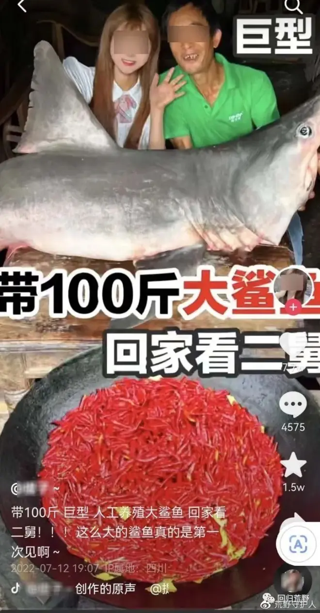 根据2023年1月28日“南充市场监管”公众号消息,2022年4月13日网红xx为了博取流量,通过淘宝网以7700元的价格购买鲨鱼一条。2022年5月29日、6月2日先后对该鲨鱼进行摆拍和烹食。7月12日将烹食该鲨鱼的视频发布到网络平台快手和抖音,后被网友识别出该博主吃的是大白鲨(噬人鲨),7月13日、14日该视频在网络上流传迅速成为全网热搜。