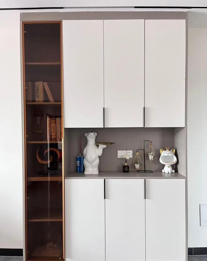 入户沿墙面设置玄关柜,底部悬空,方便换鞋。外加上透明的展示柜,可以放上几本书或者几个艺术摆件,都能增加业主的格调与生活品味。