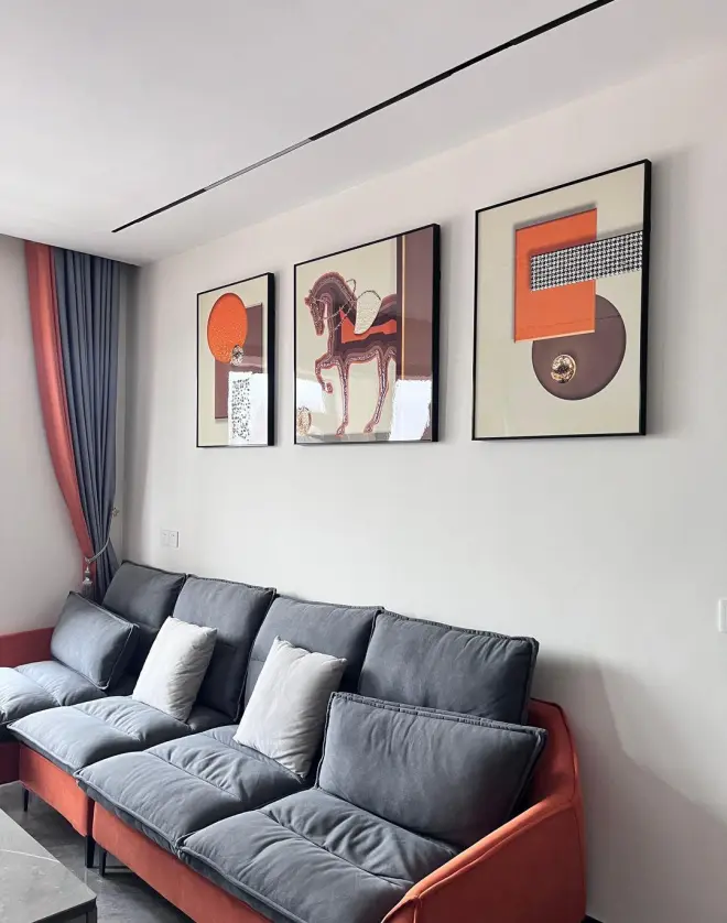 爱马仕橙的沙发和装饰画,抒写着法式轻奢与浪漫的独有美学,巧妙拿捏业主心绪,营造新的梦幻空间。