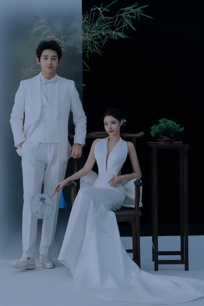 其实新中式婚纱照服装和中式婚纱照服装差不多,但是会避免一些繁重的装饰,选择“轻装上阵”。