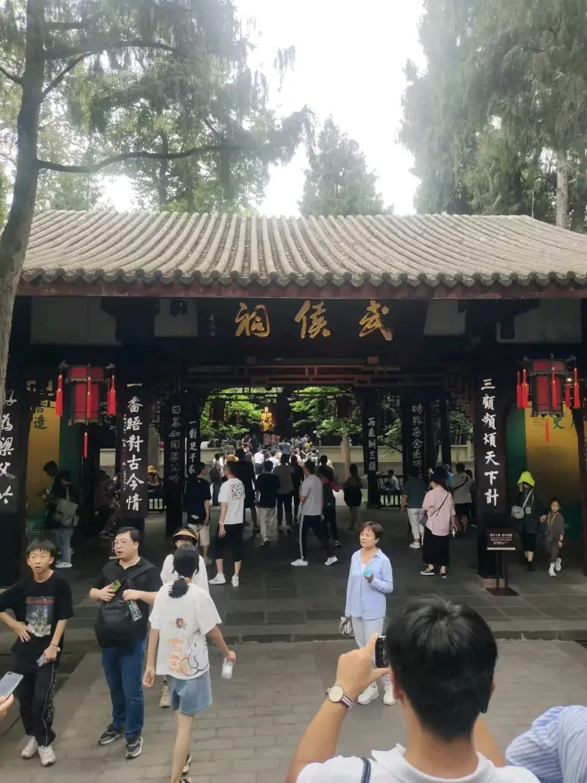 我说哪都不看,直奔亮亮,这句话好像说到你心里了,你拉着我,我能感觉到你抓我抓的好紧,手心也出汗了,我知道你心里一定很激动,快走到亮亮身边,你越抓我越紧,我能感觉到你的手在抖,我抬头看着你,我们一步一步走近亮亮身边,当我们看见武侯祠三个字时是隐约能看见了亮亮的,你也忍不住拿出来手机,先拍一张,你拍亮亮,可我只想拍你