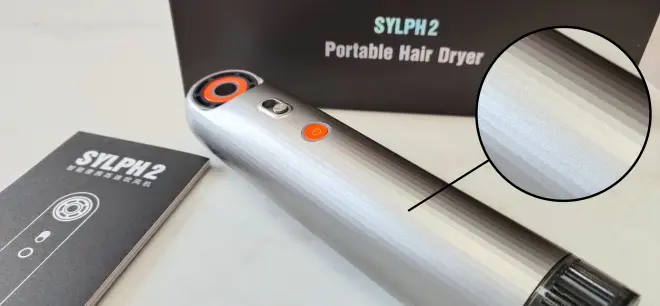 全新升级以后的SYLPH2智能便携高速吹风机,最大的升级就是外观。类似于一部手机的圆棒式结构大幅缩减吹风机体积,可以轻松收纳咋旅行箱的角落;产品手持仅重约248g,比想象的还要再轻一点,拿在手里的感觉类似于一部手机重量,轻小便携说走就走,即使旅行出差也能够享受家用吹风机带来干净舒适的吹发体验。