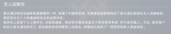 虽然车上安装了人工操作台,但因其速度、稳定性方面完全是为了物流需求考虑,并不适合载人。不过,据说每个新加入泰古通达的员工,都会被前辈忽悠着登上运输车,好像这已经成了一项固定的新人挑战项目。