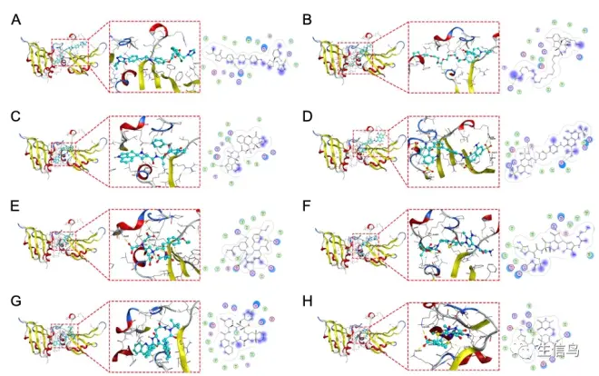 结合上述发现和已有研究,靶向HNRNPA2B1可以降低癌细胞对内分泌治疗的耐药性。使用MOE软件模拟HNRNPA2B1与小分子药物的结合姿势将HNRNPA2B1与小分子对接,找到靶向HNRNPA2B1的8种小分子药物(图5A-H)。药物预测使结果更丰富,更具有临床应用价值。