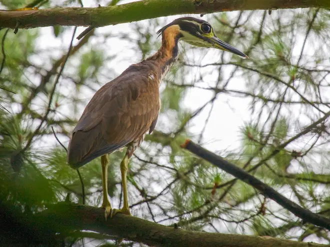 海南鳽[jiān],一种鹭科鳽属的鸟类,体形短粗肥胖,前额、头顶、头侧、枕部和冠羽均为黑色。上体为暗褐色,飞羽为石板灰绿,腹白,嘴黑,眼先和颊的裸露部为深绿色,脚为绿黑色。中国特产,海南常驻,其他地区为候鸟。栖息于高山密林中,喜欢以小鱼、蛙和昆虫等动物为食。