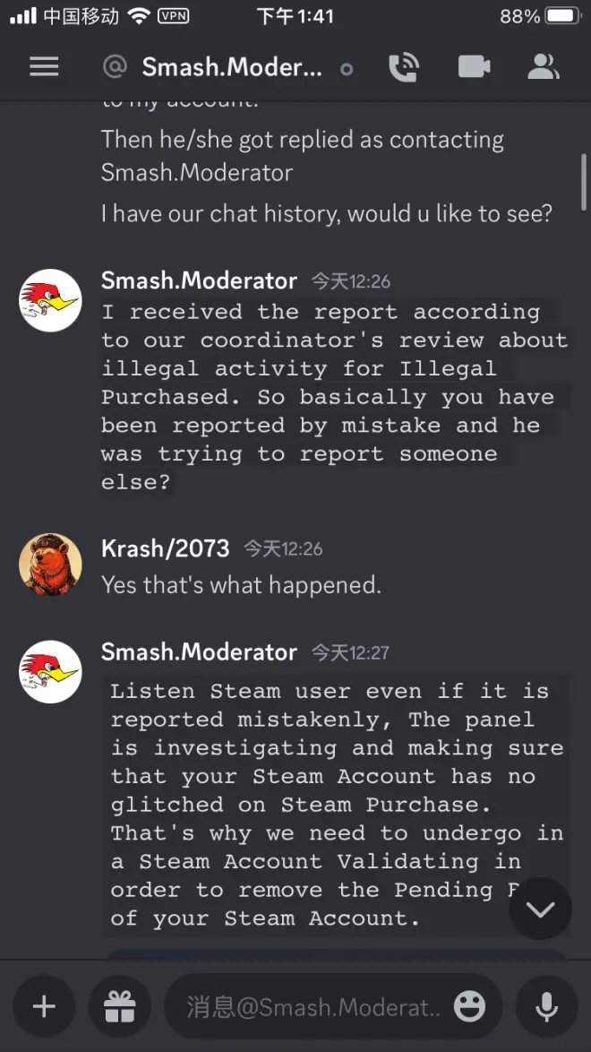 11:30左右有个(应该是)女生跑来Discord加我,问这个链接的账号是不是我的: https://steamcommunity.com/id/TSAVPYN/ 我说这是我的,结果接下来给我整懵了, 她说之前有个骗子跟她做CS:GO交易时给她发了奇怪的链接,骗走了她的所有物品(我不常玩CS:GO,也没有做过任何交易),并声称我的账号是他的(我也是倒霉,随便被抓过去当替罪羊)