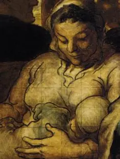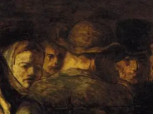 画面以棕色和褐色为主色调,红黄两色贯穿其中,沉闷压抑的气氛扑面而来。怀抱孩子的年轻母亲、饱经风霜的老妇人、涉世未深的少年与背后带着礼帽的男人,似是一个时代社会发展的缩影。18到19世纪的法国在动荡与革命的徘徊中前进,资本主义甚嚣尘上,社会风气就是“一切向钱看”,人民受到残酷的剥削压迫,处在水深火热之中,杜米埃用《三等车厢》让我们重新审视了当时社会的等级制度和社会不公。