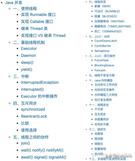 其中包括使用线程的方法、基础线程机制、线程中断、互斥同步、线程之间的协作、线程状态、AQS、JUC 其他组件、线程不安全示例、Java 内存模型、线程安全、锁优化、多线程开发良好的实战、参考资料。