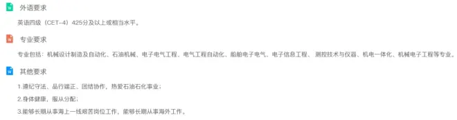 石油工程技术岗招聘单位:上海海洋油气分公司招聘人数:1人工作地点:上海、海上物探船、工程船和平台学历要求:本科要求如下: