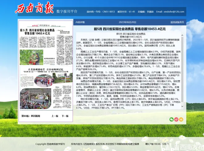 (来源:西南商报 2023年6月20日 第03版:四川新闻 前5月 四川省实现社会消费品 零售总额10453.4亿元)
