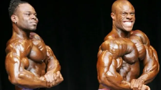 从上图可以看出,直到2006年,30岁的凯·格林应该还是自然的,他的体格比菲尔.西斯苗条许多,简直让人不敢相信。自从2007年开始,他的体重才增长到270磅,从此才追上了菲尔.西斯的脚步,2012年一2014年的奥赛,虽然,他三次输给了菲尔.西斯,但许多健美大咖都认为凯.格林的手臂和背部已经明显胜过了菲尔.西斯。