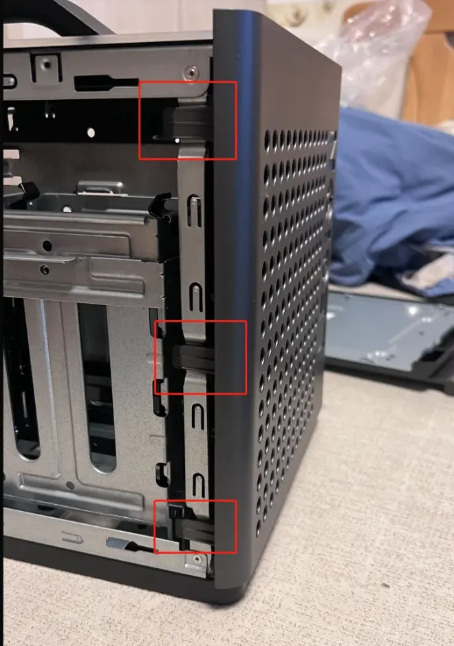 硬盘笼也有开关,按住往上提就可以把整个硬盘笼取下