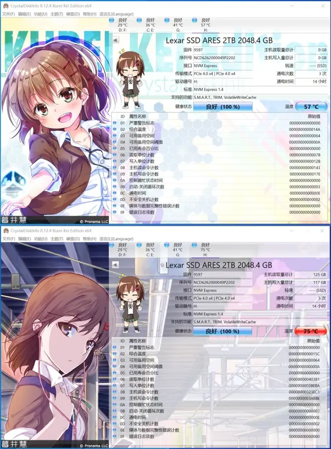 室温25度左右,雷克沙ARES战神M.2固态待机25度,连续大容量文件负载读写测试最高温75度。