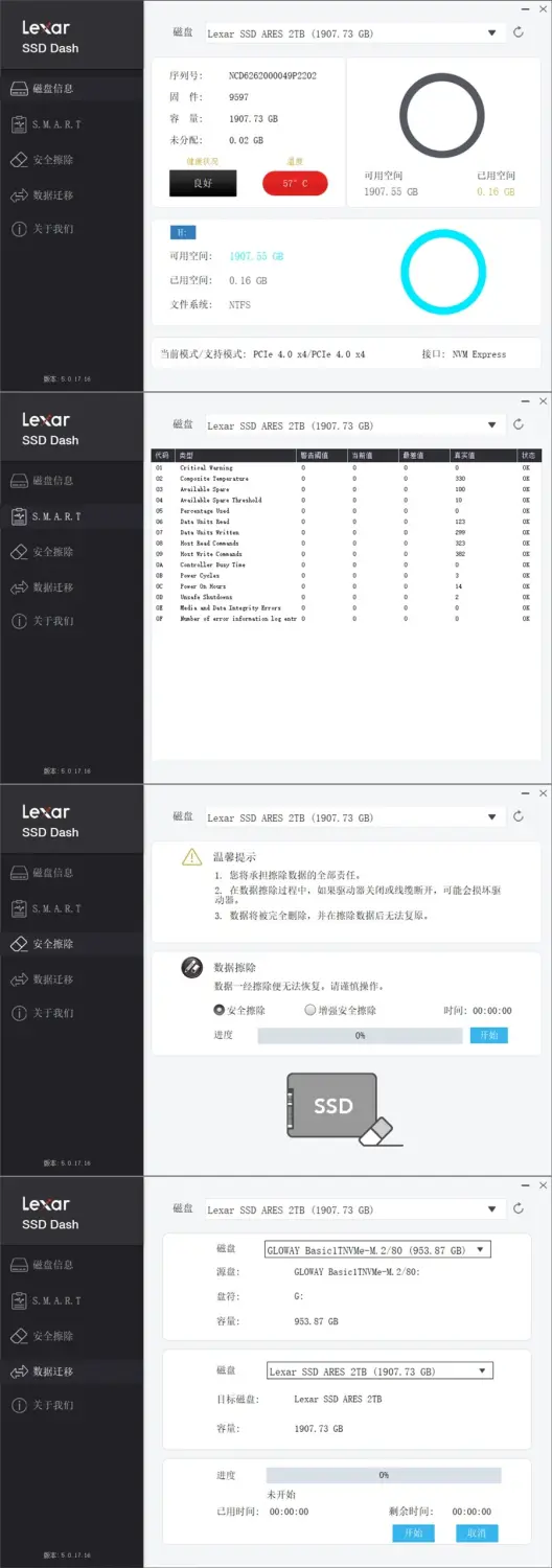 Lexar SSD Dash能提供温度显示、S.M.A.R.T、安全擦除、数据迁移等非常实用的功能,这点还是非常贴心。