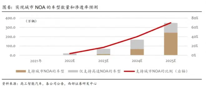 据西部证券在《2022年汽车行业报告:城市NOA重新定义智能汽车》预测,2023年搭载NOA的汽车总量或将为70万辆,2025年可能将达到348万辆。其中,支持城市NOA功能的车型占比将从2023年的17%迅速上升到70%。