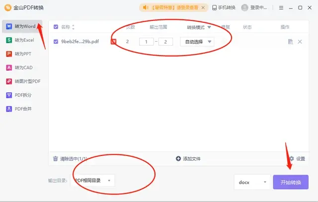 第二:跳转到实际的操作页面上,我们看到文件信息列表。我们在列表中可以选择文件的输出范围,还可以选择转换模式。设置完成后,还可以在顶部设置输出目录,全部都搞定之后,点击“开始转换”按钮,软件开始即可开始把pdf转换成word。转换好了之后,我们保存到指定位置即可。