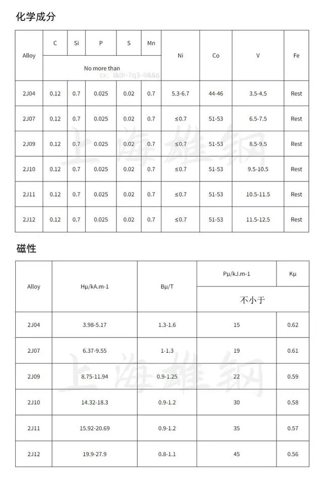 2J04作为一种半硬磁性材料,2J04合金具有高饱和磁感应强度的特点。该合金在回火前具有良好的塑性,适用于剪切和切割。该合金具有良好的变形能力,冷变形可获得优异的磁滞性能,可用于工作的磁场为4 ~ 32 kA/m磁滞电机。2J4合金在150°C至-—140°C范围内不会引起磁性能的下降,因此用于航空航天中的导航陀螺仪。研究发现,2J4合金在冷变形后压缩比达到90%以上,可以获得优异的迟滞性能。