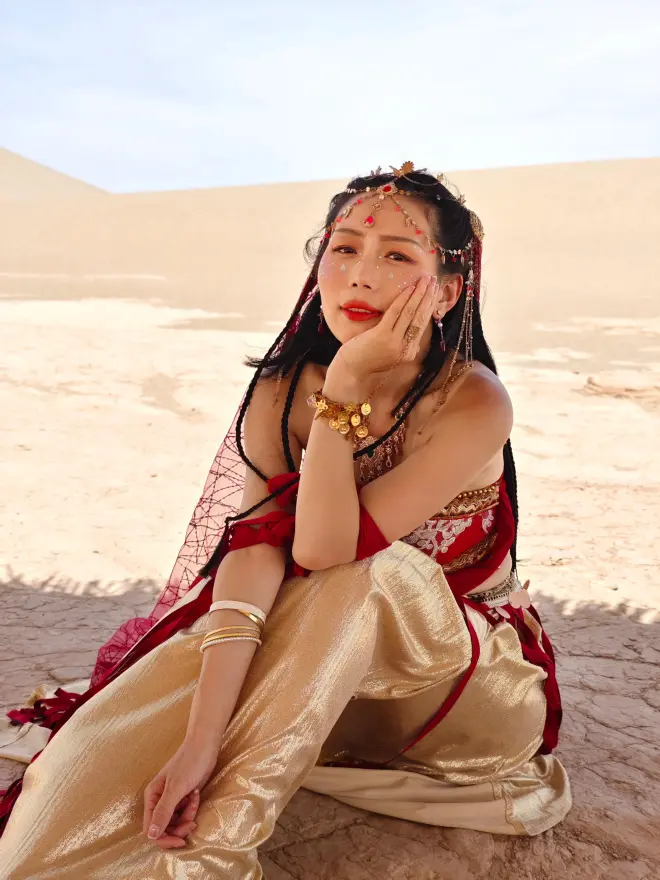 鸣沙山景区门口有不少化妆租民族服饰的地方,具体我这种直男也评论不出什么,就是看见景区里异域风情挺浓的,估计来这里的女游客大多都会选择体验下。第二天上午我老婆就体验了一把,景区里人少的确是挺好拍的,就是真的热,到中午的时候就已经扛不住出景区了。