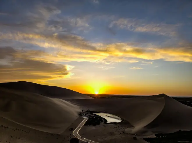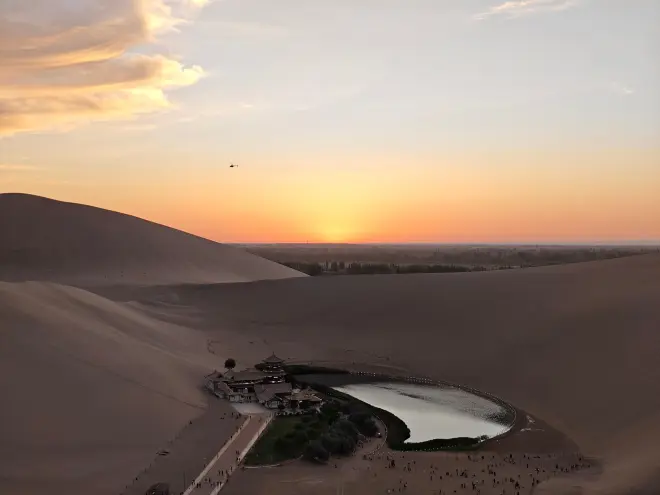 个人觉得鸣沙山月牙泉还是挺好玩的,沙漠山爬着虽累但挺有意思,喜欢玩的也可以滑沙,另外腰包鼓的还可以乘坐直升机、滑翔机看美景,这里也有一大群的骆驼骑,甚至还有专为骆驼队过马路设置的红绿灯。当你爬上山顶后,可以静待日落或者日出的到来,那一刻的月牙泉充满了无限的魅力,令人一眼难忘。