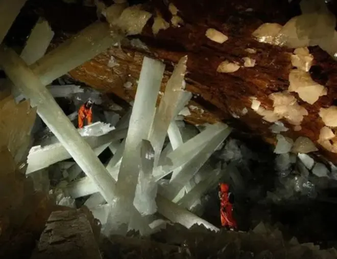 矿洞内拥有一些巨大的水晶簇,其中最大的一块水晶据估算重达55吨,上面覆盖着丝绸状的细晶体,看上去就像是一片雪花铺成的地毯。这些水晶是由钙质晶体组成的,通过流动的水和地球内部的热力学作用来形成的。