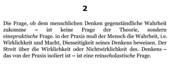 人的思维是否具有客观的真理性,这不是一个理论的问题,而是一个实践的问题。人应该在实践中证明自己思维的真理性,即自己思维的现实性和力量,自己思维的此岸性。关于思维——离开实践的思维——的现实性或非现实性的争论,是一个纯粹经院哲学的问题。