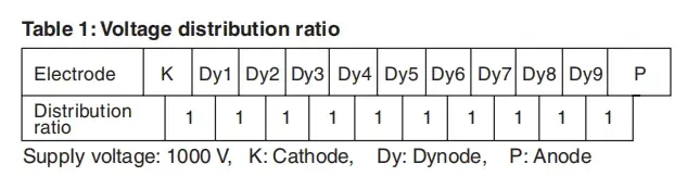 Supply voltage between anode and last dynode:是指该型号光电倍增管阳极和最后一级打拿级之间额定最大的电压值。