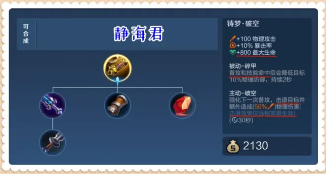 碎甲:普攻和技能命中后会降低目标10%的物理防御,持续2秒。