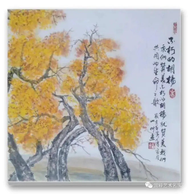 袁伟雄先生带着现实主义的写生积累,让浪漫主义在胡杨主题里生根发芽,创建了富有时代寓意的新派山水胡杨画风,达成了一种全新的审美空间,这真是笔墨当随时代的经典。在地域范围上,先生把胡杨的生存环境由大漠边关,铺陈进了万水千山!既是他笔下的胡杨,已经从纯自然的物象,晋级为精神的代言体,更多地包含进了人的思维、情绪、意识、价值观。