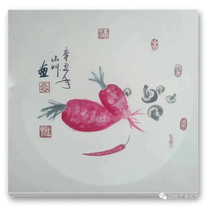 袁伟雄先生用色考究,自己通过多年来的研究试验,调制出与虾接近的色调,体现了虾的真实感,墨分五色,清淡典雅,富贵舒适,在简略的笔法中显得晶莹剔透,质壳明显,湿润清晰,给人以感观温和清新的画面。