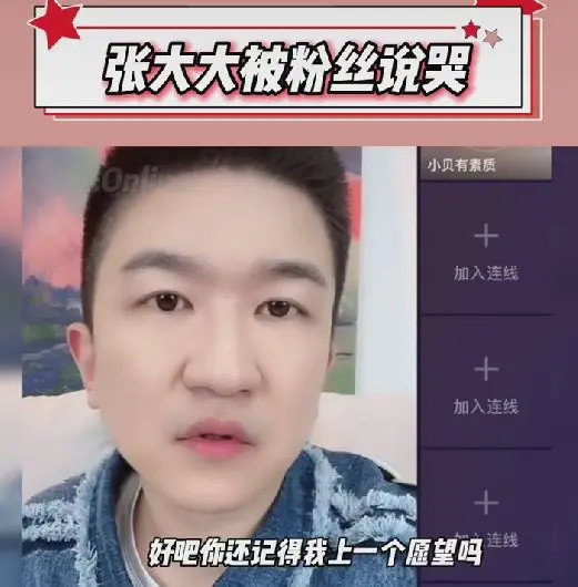 值得一提的是,隔了两天,小贝又一次连上了张大大,对方一上来就问,既然你要我许愿望,那你知道我上一个愿望是什么吗?此时张大大的脸色有些难看,甚至有人猜测,感觉下一秒张大大就要哭了。