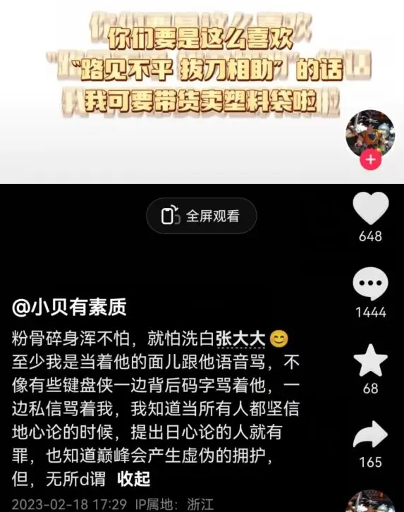 18日晚上,小贝特意发了一条视频,文中写道:粉身碎骨都不怕,就怕洗白张大大,至少我是和他语音对骂,不像有些键盘侠,只会在背后骂他。